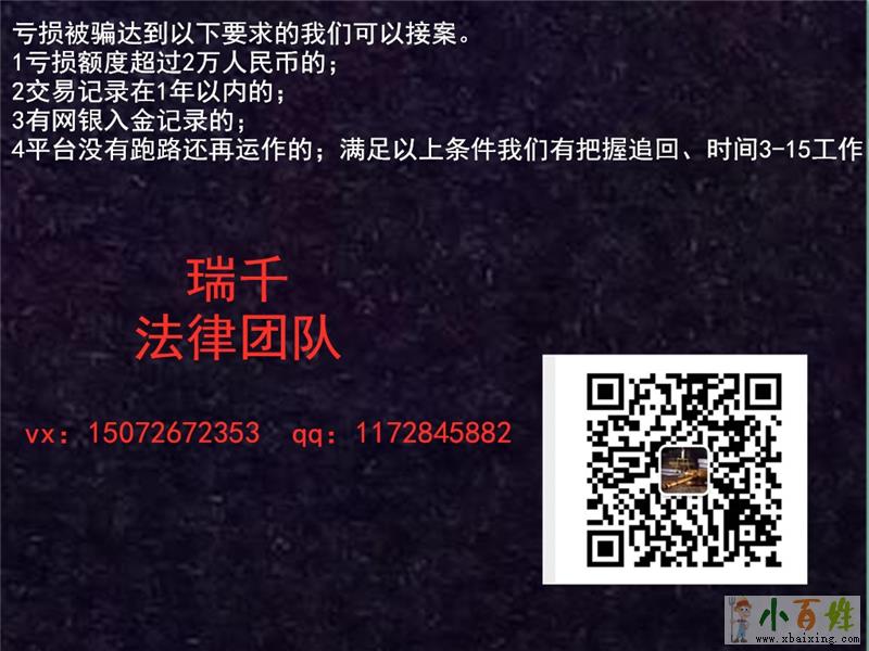 受害者的自述:我是浙江杭州的王彭,大概在今年开年的时候,因为创业失败了闲着没事干,天天在家不是打游戏就是跟朋友们一起出去玩,游手好闲的。我爸妈看着我这样一天天不是个事,他们看不惯我,身边的亲戚朋友也看不惯我说我这么大一个小伙子不干正紧事只知道玩。其实我自己也知道,这样下去也不行。后面我跟爸妈商量了一下,准备给我拿80万开dian,让我自己做做小生意。我觉得也很不错,但让我完全没有想到的是可怕的经历正在像我一步一步走来。在为了我的事业所做准备的时候,一位vx名叫云淡风轻的人加了我,而我想着我自己开始创业了,我就毫不犹豫的加上了她USP。刚开始就随便聊聊,在大家都相互了解了个大概(我把我拿着爸妈的80万准备开dian的事给她说了)我应该就是这么个人吧,对人都不带保留了。之后她开始慢慢的给我透露她的故事,我之前看她朋友圈,有时候会有一些出国旅游的照片,还有一个自己开的茶楼,规模也比较可以,聊天的时候我就去问了他,该怎么创业!他也就跟我说了一个大概!她说她的钱最开始家里就给了5万,其他的都是自己在网上做投资赚的,就在这个平台投资了,里面有专业的老师,带着她赚的钱,她说自己也不是很懂,就跟着老师操作就行了,老师说怎么做她就怎么做。听着我很心动,也想拿着钱去试试,毕竟这么容易发财的机会很难得遇到(见钱眼看了),但是我又很犹豫,这个钱可是爸妈的养老钱,现在拿出来给我投资,我不能把这笔钱给败光了然后她就开始慢慢的劝导我,说这个平台很稳的,百分百的能保我赚上钱,说她自己就是个例子,跟她聊了这么就我已经很信任她了,慢慢的我的心动摇了,我想试试,我想挣上钱在亲戚在父母身边扬眉吐气。让我万万没想到的是我的噩梦才刚刚开始。跟着她的推荐,我进入了一个所谓会员身份才能进入的vx群,群里面大概有3位老师,主要是一个黄仰东老师,开始的时候是在群里面发视频链接,让我们自己去看,讲解你该怎么怎么入金那些的,我也不是很懂。我也想的多,前面就入了10万块钱,先试试水,然后就几天的时间就小赚4万,之后心里就开始膨胀了,我膨胀的时候,他们很会琢磨人的心理,我当时想的是自己过段时间在操作,毕竟自己赚了一点,他们没有挽留我的意思,就说如果手上的资金充足可以加大资金,因为马上会有一个大的布局,20万至少可以获利12万,我当时因为第一次在这里赚钱,还是有点不放心,所以我就没有着急进去!我不着急他们也不催我,直到布局马上开始的时候他们的直播课程开始了,黄老师每天在直播间里面说他的推断跟预测,听得很多人都心动了,我也心动了,直到布局结束的时候,小晗给我发消息了,问我这次赚了多少钱,我说我还没有投钱进去呢!她表现的一副非常懊恼的样子,因为我听黄老师的课也有一段时间了,我就问了一下她这一次赚了多少,他说也没多少,就投了100万进去,赚了70多万左右吧,然后给我看了他的账户截图,一串数字深深的挑起了我的我的贪心还有贪恋www.xbaixing.com小百姓网。为了这个事情我还懊恼了很久,不过后来他跟我说有一个翻番的行情机会,有游资还有私募都会介入进来,我们可以跟着一起喝点汤,当时我就拿着我所有的资金,差不多80万左右(前面让我赚了4万,先让我尝到甜头)一下子全部入在里面,结果不到5天,只剩下1万左右了,那一天的我感觉天都要塌下来了。找老师,不理我,找她也是不回我消息,后面直接把我删了。知道这时候我才反应过来我是被他们一起骗了。之后的半年左右我真的活着就只会拖累别人,我都不知道我这半年是怎么熬过来的。现实真的把我打的爬不起来了,爸妈看着也着急。我甚至起过自杀的念头,父母也不敢过多的劝说我小百姓网。这件事对我的打击实在是太大了。好在我一个出国留学的朋友回来之后听说了我这件事之后告诉我他有个朋友就是专门做法律咨询的,他让我试着找一下他。然后我就抱着死马当活马医的态度去把发生在我身上的这件事告诉了这位朋友,没想到的是他告诉我我的钱可以追回来,之后短短的三个工作日的时间,这个黑平台的人就主动联系到我然后就把我的资金全部打到我的卡里。态度对我也是恭恭敬敬的。