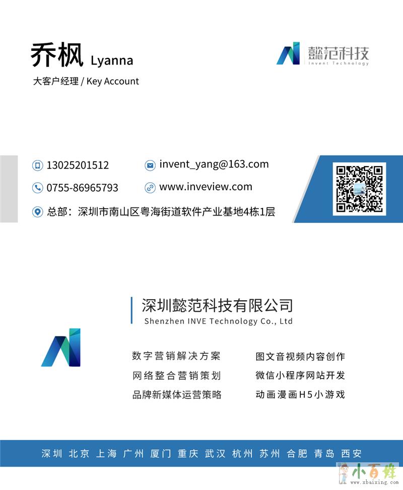 懿范INVE是一家在大数据和社交网络时代为企业智慧经营全面赋能的营销科技公司小百姓网www.xbaixing.com。懿范INVE及其旗下子公司的业务板块有营销服务(新媒体内容运营、互联网数字营销、广告公共关系、互动活动策划等)、技术服务(小程序定制、微商城网站开发、H5小游戏设计)和国际及港澳台地区业务,服务内容涵盖营销传播整个产业链,以及基于创意内容、数据科技的智慧营销服务,服务对象覆盖多个大型企业,包括可口可乐、大众汽车、阿迪达斯、兰蔻、优衣库等。 懿范INVE持续服务于约300个国内外品牌客户,其中500强企业47家,客户涵盖服装、护肤、汽车、消费品、房地产、互联网、金融、酒店多个行业的知名品牌。